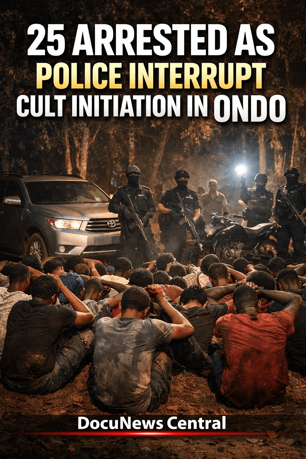 Uso, Owo LGA, Ondo State, Nigeria — Thursday, January 8, 2026 (Late Afternoon): The Ondo State Police Command disrupted a clandestine gathering suspected to be a cult initiation ceremony. They arrested 25 individuals and recovered a Toyota Highlander SUV and an unregistered motorcycle. The swift intervention prevented a potential security threat for Uso and nearby communities. Vanguard News