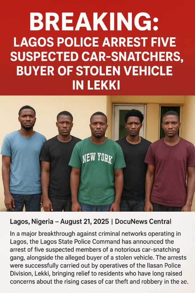 In a major breakthrough against criminal networks operating in Lagos, the Lagos State Police Command has announced the arrest of five suspected members of a notorious car-snatching gang, alongside the alleged buyer of a stolen vehicle. The arrests were successfully carried out by operatives of the Ilasan Police Division, Lekki, bringing relief to residents who have long raised concerns about the rising cases of car theft and robbery in the area.
