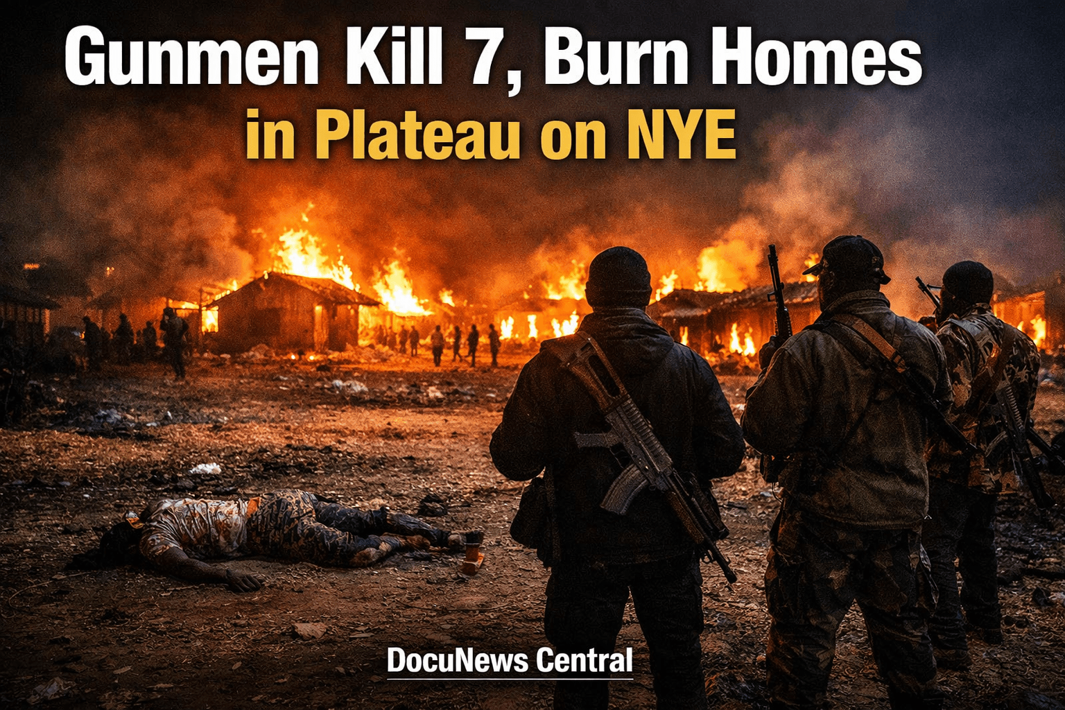 Residents of a Plateau community were thrown into mourning as gunmen stormed their town on New Year’s Eve, killing seven people and setting multiple homes ablaze. The attack occurred late on December 31, 2025, leaving families traumatized and prompting immediate calls for stronger security measures across the region. And this incident made headline on Docunews Central saying that Gunmen Kill 7, Burn Homes in Plateau on New Year Eve Witnesses described scenes of chaos as screams filled the night and flames consumed property within minutes. Recent Plateau security updates show an alarming rise in violent attacks across the state, making the need for effective response urgent. Read also New Year’s Day Attack: Ondo Police Station Set Ablaze by Terrorists