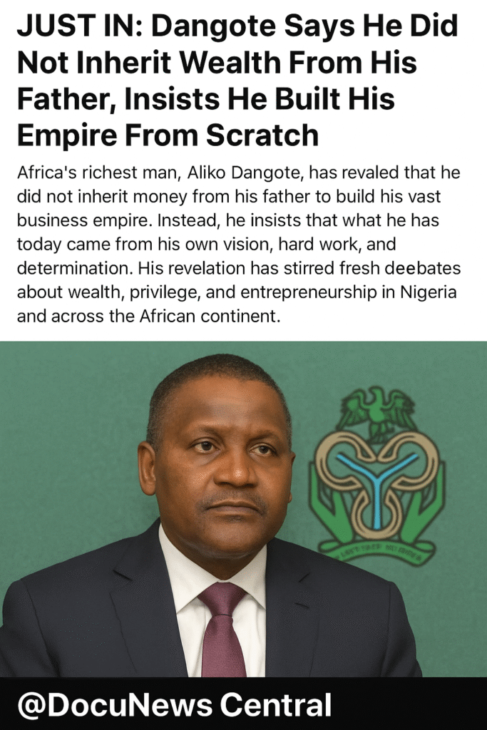 Africa’s richest man, Aliko Dangote, has revealed that he did not inherit money from his father to build his vast business empire. Instead, he insists that what he has today came from his own vision, hard work, and determination. His revelation has stirred fresh debates about wealth, privilege, and entrepreneurship in Nigeria and across the African continent.